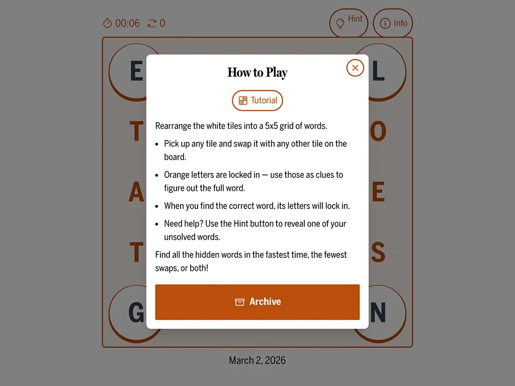 When you correctly complete a word, all of its tiles lock into place, confirming you got it right. Solve all ten words and the entire grid locks. You can aim to finish in the fastest time, use the fewest swaps, or enjoy working through both at your own pace.